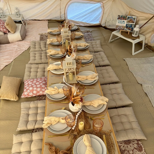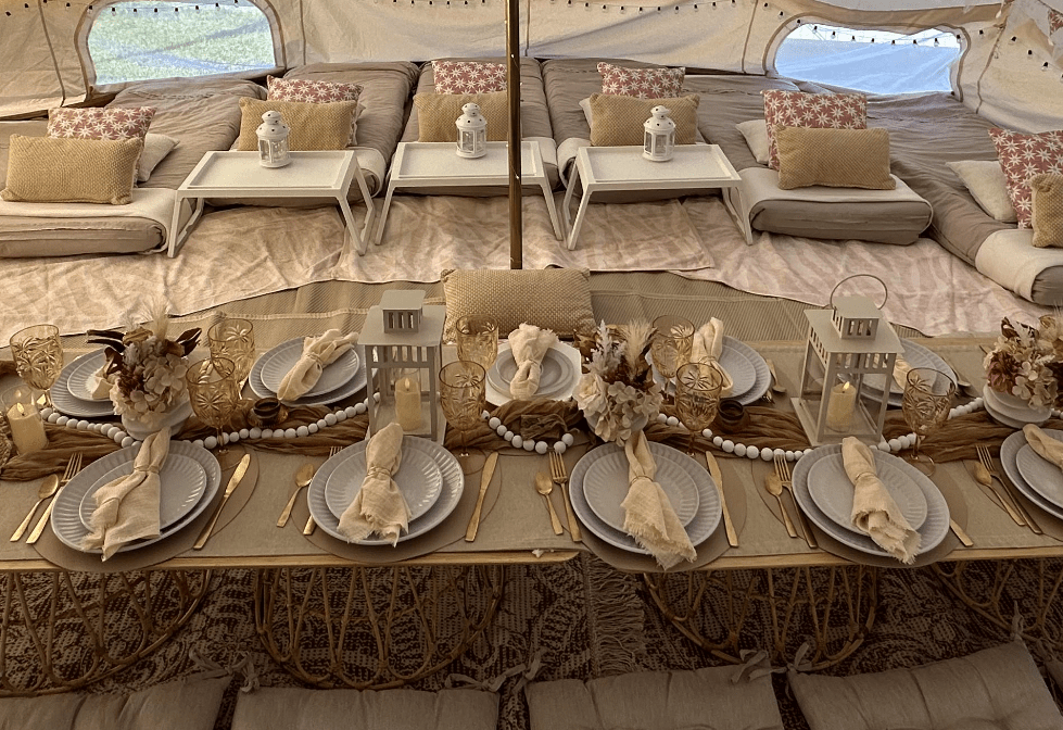 Includes delivery and pack up, rugs, cushions, low tables, plates, cutlery, napkins, drinkware, decorative items and a personalised greeting board – all styled by us!