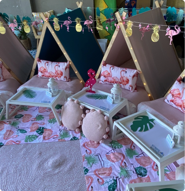 Our services include delivery, set-up and take down. Our parties are perfect for sleepovers and birthdays. We have an array of themes available for boys, girls and adults! Book us for your next slumber party with the BEST glamping experience!