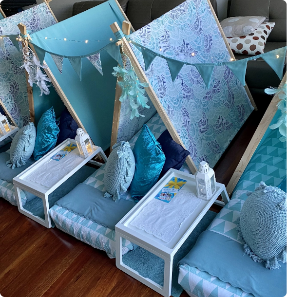Our services include delivery, set-up and take down. Our parties are perfect for sleepovers and birthdays. We have an array of themes available for boys, girls and adults! Book us for your next slumber party with the BEST glamping experience!